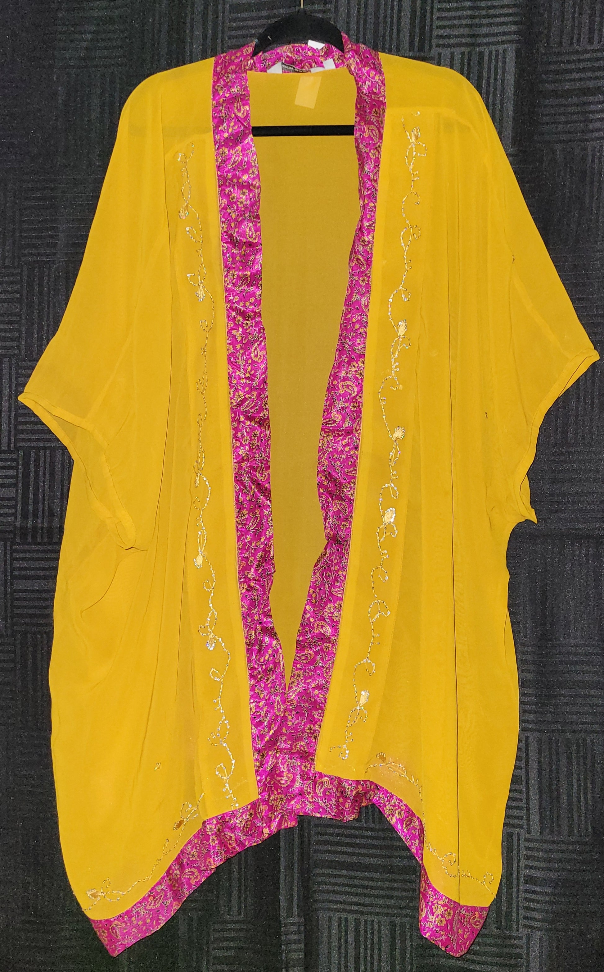 This open-front duster will add class and style to any outfit. It's sheer, mustard yellow fabric is embroidered with gold beads down both sides of the front and randomly placed on the rest of the garment. Sparkle! The pink silk fabric of the placket is perfectly coordinated to elevate this piece. It's a great layering piece for any outfit.