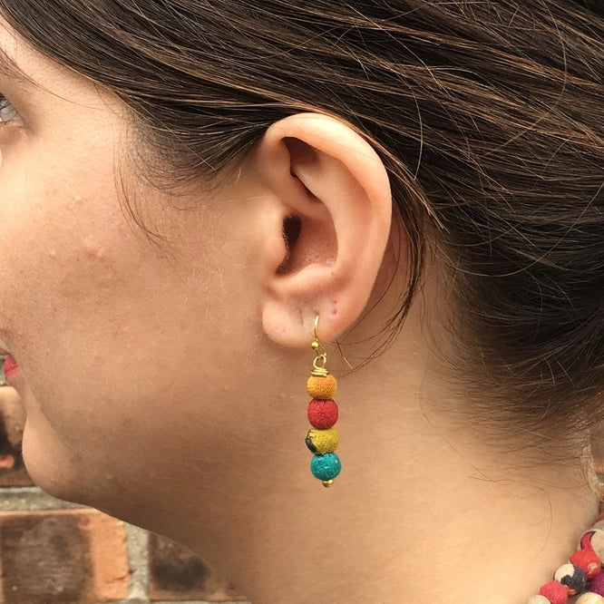 Quatre Kantha Earrings - Four small colorful Kantha textile beads are stacked for a streamlined, delicate earring. Measures 1.5" long