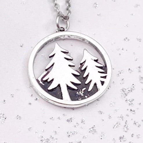 Round pendant necklace featuring a cut out of two pine trees and highlighted with black enamel. Includes a 20" chain with a 2" extension. Pairs well with our Pine Tree earrings.
